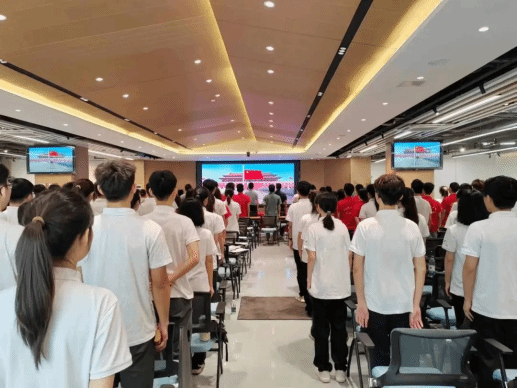 在庄严的旋律中,全体人员肃立,面向国旗,奏唱国歌。