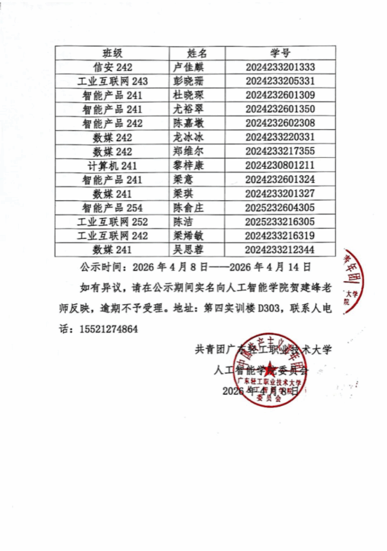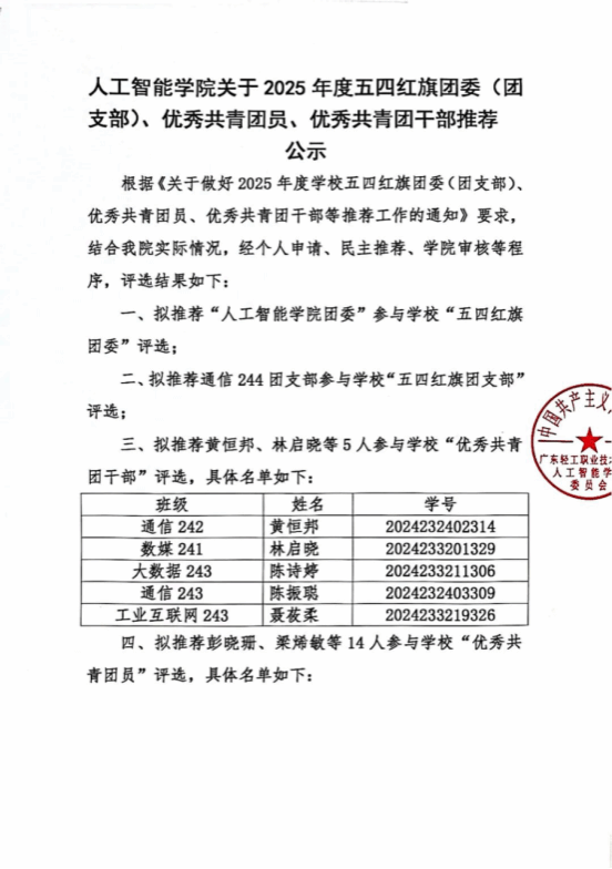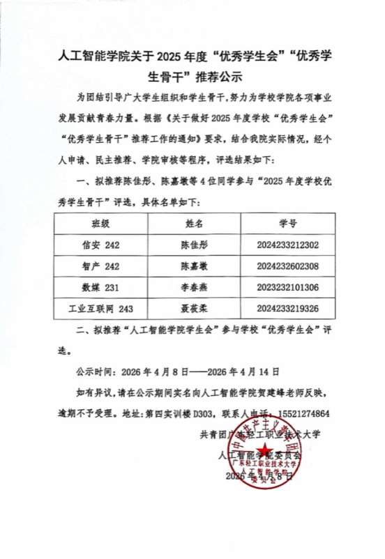 人工智能学院关于2025年度“优秀学生会”“优秀学生骨干”以及五四红旗团委(团支部)、优秀共青团员、优秀共青团干部推荐公示 3 2026-04-08 11:34:37 人工智能学院关于2025年度“优秀学生会”“优秀学生骨干”以及五四红旗团委(团支部)、优秀共青团员、优秀共青团干部推荐公示如下: