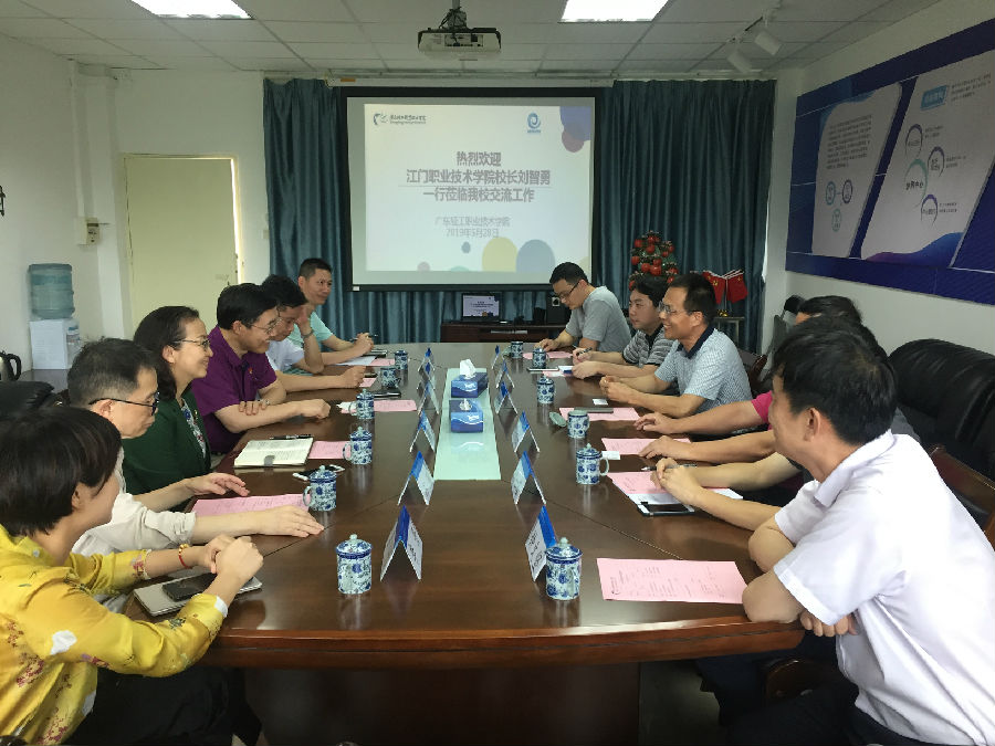 江门职业技术学院来访我院交流 167 2019-05-30 10:15:25 5月28日下午,江门职业技术学院校长刘智勇、江门市职业联合会会长陈积业一行访问我校。我校校长卢坤建在南海校区第四实训楼新工科协调中心接待了来访客人。会上,我校介绍了与华为公司在产教融合、人才培养方面的合作历程、合作内容、做法以及合作成果等,双方就华为信息与网络技术学院建设方面的具体细节进行交流。随后,来访客人参观了南海校区华为ICT创新人才培养基地。信息技术学院院长秦文胜及相关人员参与接待。