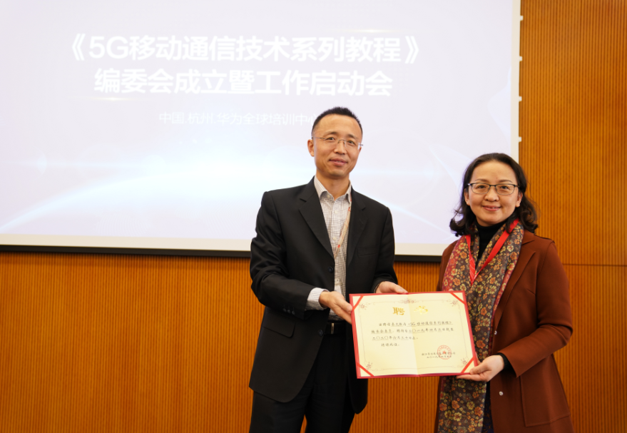2019年4月2日,浙江华为《5G移动通信技术系列教程》编委会成立暨工作启动会在华为全球培训中心新址隆重举行。来自东南大学、南京航空航天大学、南京邮电大学、中国计量大学、广东轻工职业技术学院、深圳职业技术学院等院校的30多名专家学者齐聚一堂,为教材编写汇智谋篇。我校秦文胜教授作为广东省两所高校之一的代表应邀出席会议,并现场受聘为华为5G系列教材编委会专家委员。