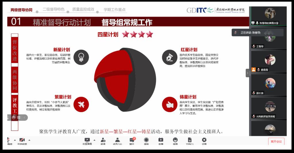 2021年9月27日下午,信息技术学院在线上召开“两级督导工作总结与计划交流会”。学院领导班子、二级督导组成员等参加会议。会议由督导组副组长王正勤副院长主持。