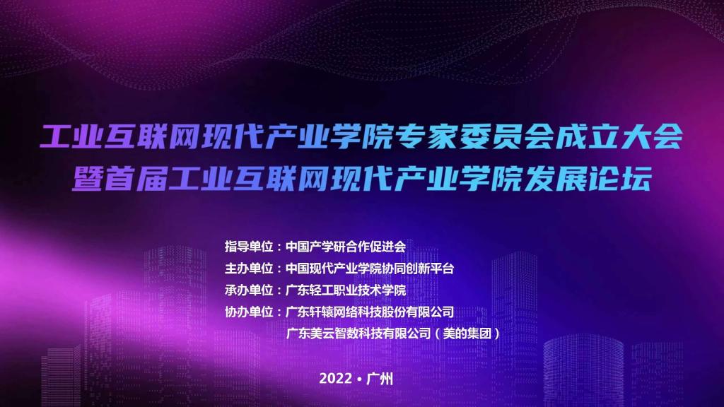 2022年5月20日,首届工业互联网现代产业学院发展论坛暨工业互联网现代产业学院专家委员会成立大会在广东轻工职业技术学院以线下会议结合线上直播的方式隆重举行。论坛在中国产学研合作促进会指导下,由中国现代产业学院协同创新平台主办,广东轻工职业技术学院承办。论坛以“多方协同共建现代产业学院,构建开放合作共赢新格局”为主题,旨在共商工业互联网现代产业学院建设。