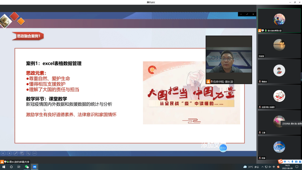 通过本次分享活动,让任课教师认识到课程思政改革和信息化建设重要性,增进了课堂教学设计和自评反思的深入了解,希望后续课程教学中,能借鉴计算机基础课程教改的策略、方法等,促进各类课程教学改革,提升课程信息化程度,多角度进行课证融通,激发学生学习热情,提升学生学习效果。