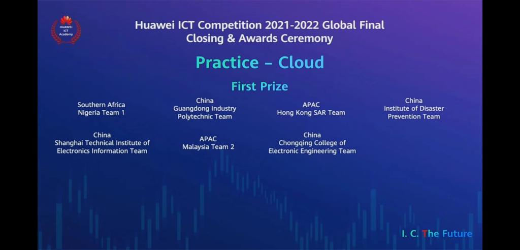 6月17日,华为ICT大赛2021-2022全球总决赛在深圳华为坂田基地开幕,大赛以“联接、荣耀、未来”为主题,以“I. C. The Future”为口号。在全球总决赛实践赛中,本科、高职队伍同台竞技,经过激烈比拼,广轻学子 信息技术学院参赛队伍(指导教师:李丹,队员:云计算202郑庆鸿、网络192王伟、网络192吴晓娜)获得全球总决赛实践赛云赛道一等奖。