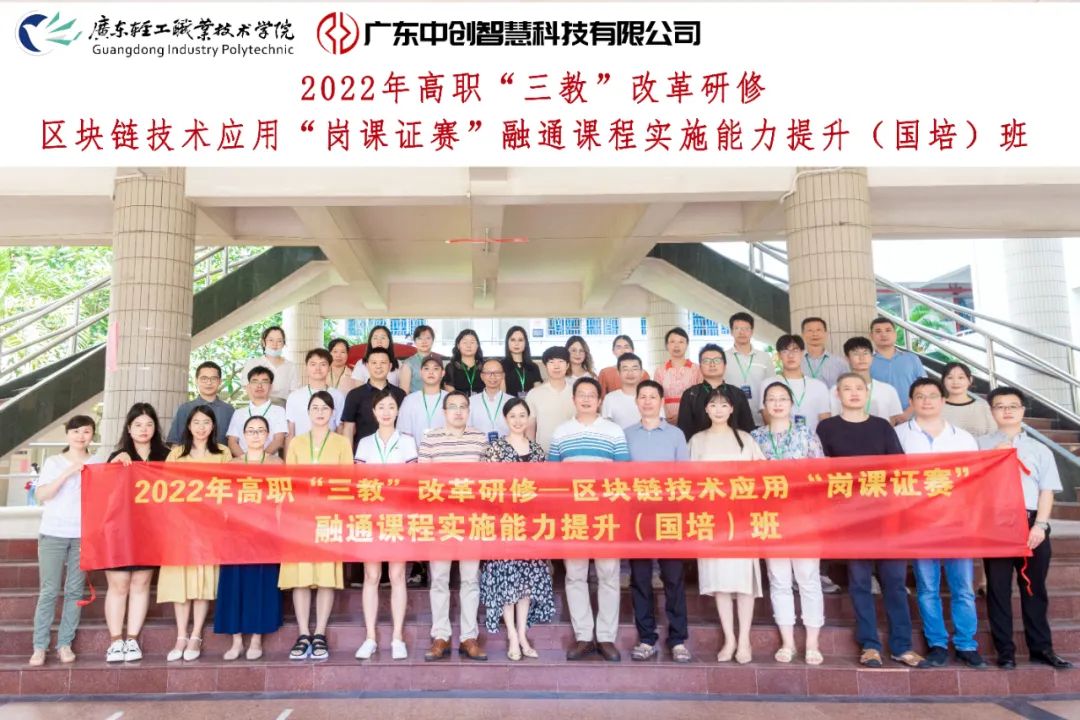2022年7月24-30日,由广东轻工职业技术学院信息技术学院和广东中创智慧科技有限公司联合承办的“2022年“三教”改革研修——区块链技术应用“岗课证赛”融通课程实施能力提升(国培)班”顺利在广东轻工职业技术学院举办,来自全省24所高职院校的40位骨干教师参加为期7天的培训,本次培训主要采取线下集中面授、企业考察观摩、线上实操等形式。