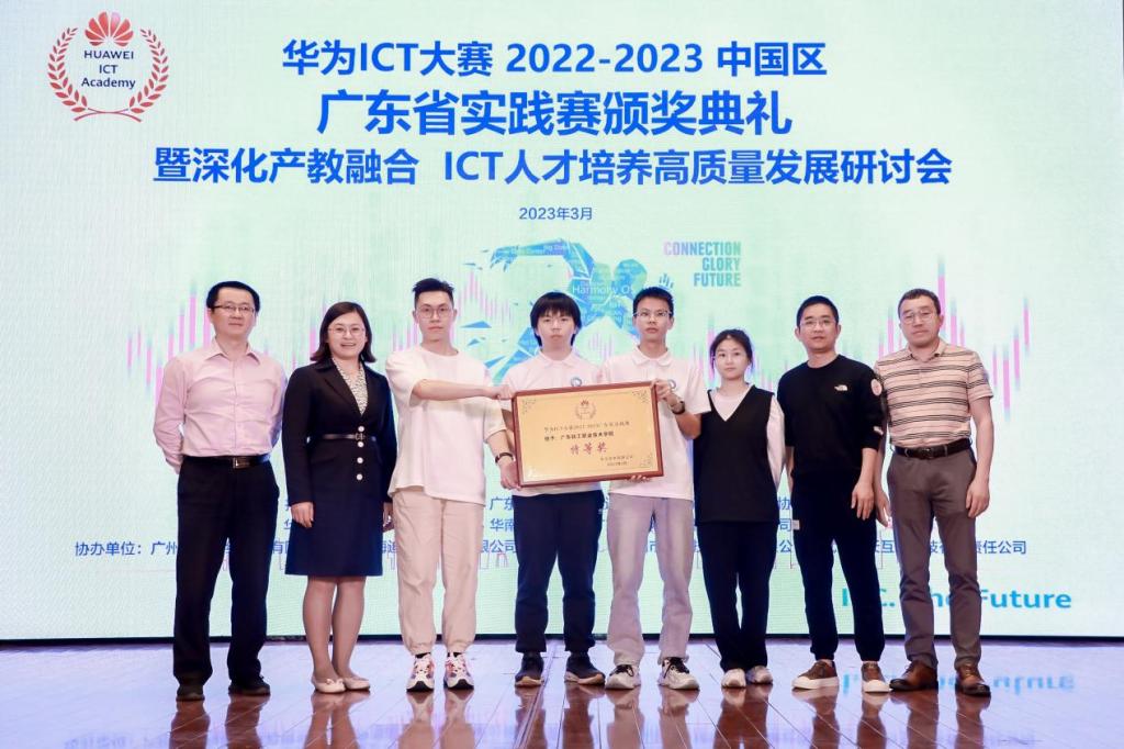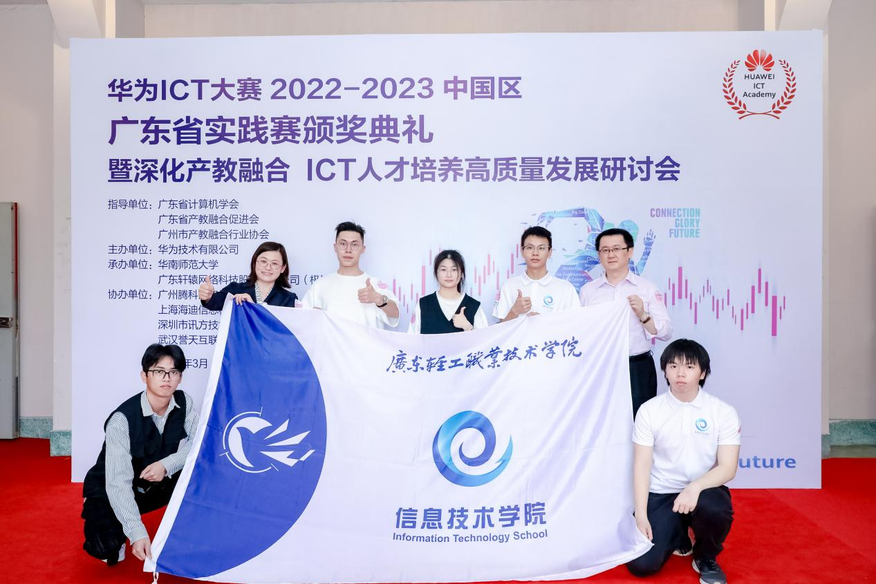 近日,华为ICT大赛2022-2023中国区广东省实践赛决赛落下帷幕,并于3月19日在华南师范大学举行了颁奖典礼暨深化产教融合ICT人才培养高质量发展研讨会。此次决赛是由从全省92所高校4060名学生中脱颖而出的78所高校530名学生同场竞技,经过激烈的比赛,最终我校信息技术学院2020级云计算技术专业梁嘉豪、申鹤翔、和通信技术专业苏健明3名同学,荣获云计算赛道特等奖。同时2020级通信技术专业陈雄、何平,和云计算技术专业李运浩3名同学获得网络赛道二等奖; 2020级网络技术专业彭颂凌和通信技术专业林海腾2名同学获得网络赛道三等奖;2020级云计算技术专业吴程振、吕家浩、李永昌3名同学获得云赛道三等奖。