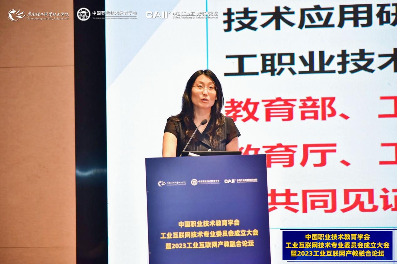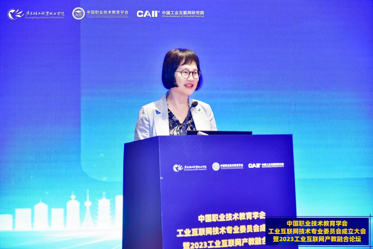 广东省教育厅二级巡视员吴艳玲致辞,她指出,中国职业教育学会工业互联网技术专委会设在广东轻工职业技术学院,为广东职业教育高质量发展增值赋能,对广东的职业教育发展注入了更强劲的驱动力。工业互联网是实体经济数字化转型升级的关键。广东积极推进制造业数字化转型升级,以数字化赋能制造业产业转型升级。广东轻工职业技术学院要协同广东职业教育学会,认真地推进好中国职业技术教育学会交办的各项工作,认真做好工业互联网专委会的各项工作,争取取得丰硕成果。