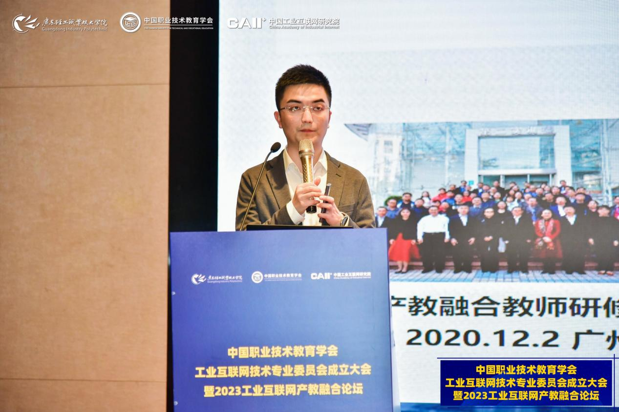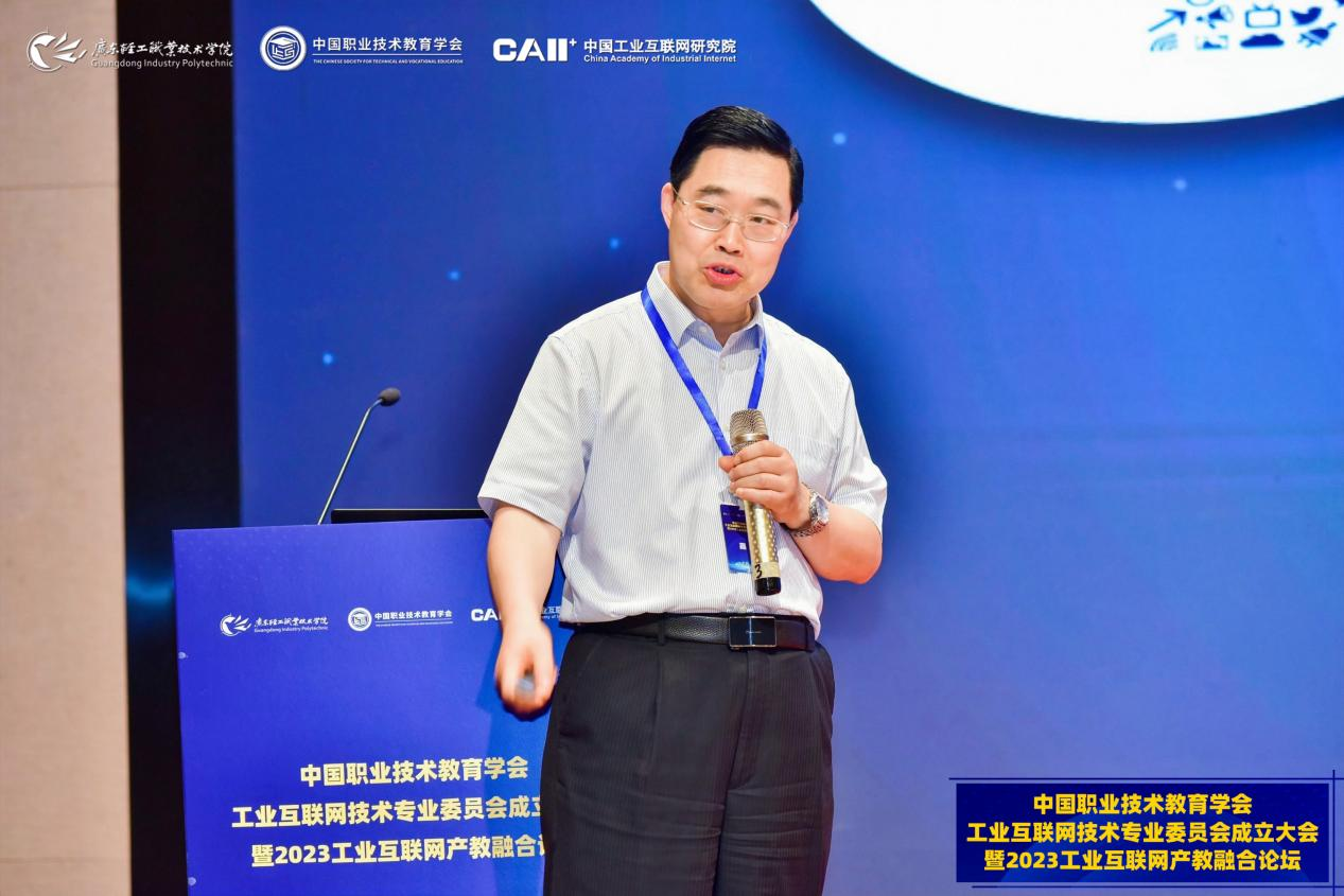教育部职成教司综合改革处二级调研员李红东线上出席会议并致辞,他表示,中国职教学会主动适应产业发展需求和人才培养需要,组建工业互联网技术专业委员会,积极探索工业互联网领域的产教融合、科教融汇,促进教育链人才链与产业链、创新链的有机衔接,体现了中国职教学会高度的时代自觉和责任担当,并对工业互联网技术专委会建设提出指导性要求和建议。