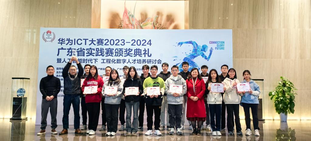 近日,华为ICT大赛2023-2024中国区广东省实践赛决赛落下帷幕,并于12月24日在华南理工大学举行了颁奖典礼暨人工智能时代下工程化数字人才培养研讨会议程。此次决赛是由全省103所高校7278名学生中脱颖而出的86所高校640名学生同场竞技,经过激烈角逐,我院6支参赛队伍获得广东省总决赛特等奖一个,一等奖两个,二等奖三个。