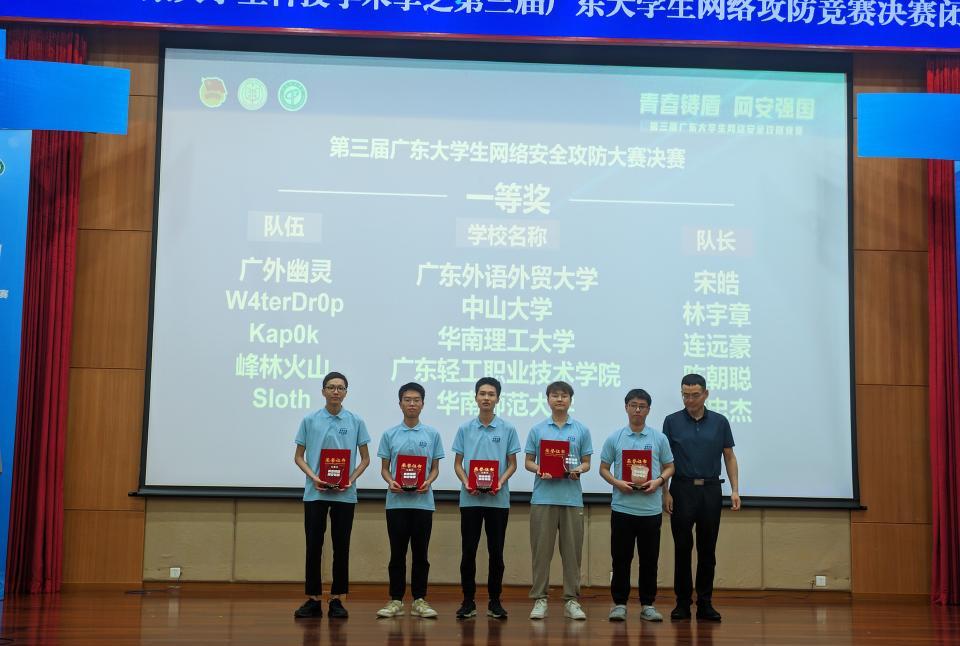 6月2日第十七届广东大学生科技学术季活动之第三届广东大学生网络安全攻防大赛决赛在东莞理工学院隆重举行。信息技术学院工业软件开发221陈朝聪、软件221黄智峰、软件222姚阳和工业互联网222包健鹏四名学生组建的“峰林火山”战队荣获一等奖,是获得一等奖的五个团队中唯一的一所高职院校。指导老师辛继胜,冼广淋。