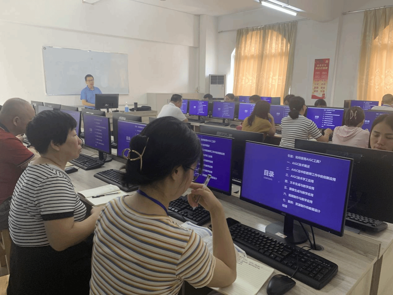 线上培训结束后,培训活动迅速转入线下实战阶段。在5月25日至26日,6月18日至19日,信息技术学院派出赖晶亮、陈建潮老师前往惠来县和德庆县,在驻地吴威老师的支持下结合教学实际量身定制培训,内容涵盖AIGC、虚拟仿真、微课制作等前沿技术在教学中的应用。培训通过互动式教学、实战演练等方式,帮助教师们将线上所学理论知识转化为实际操作能力,进一步提升了他们的信息技术应用能力。