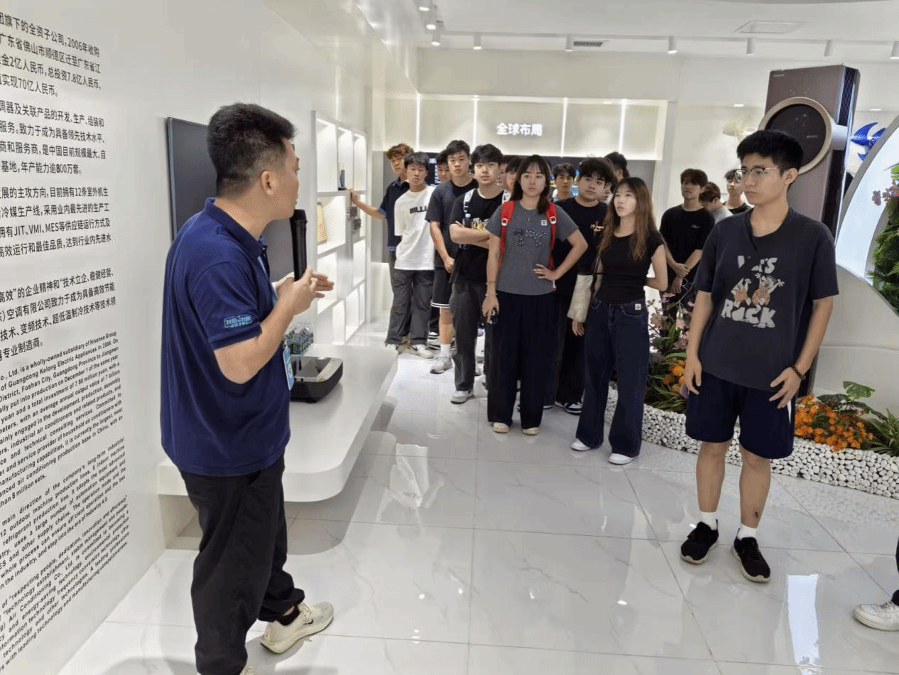 下午,师生转赴江门,参观海信(广东)空调有限公司。海信作为家电行业的领军企业,在智能家电、空调产品的研发与制造方面具有深厚积累。同学们实地走访了智能化生产车间,近距离观摩空调产品的组装与检测流程,感受智能制造的实际运作。